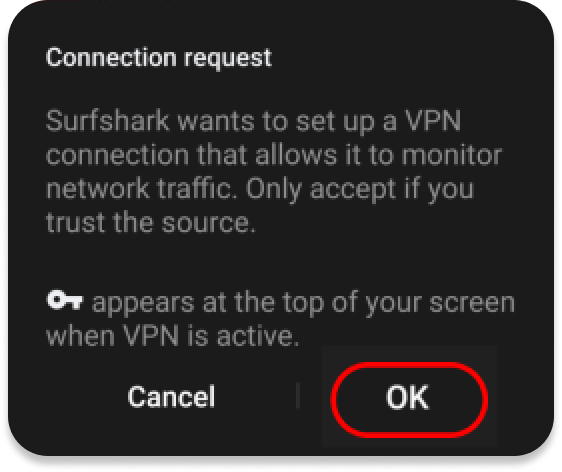 NOTE: If you haven’t granted VPN permissions to Surfshark before, you’ll have to do so to proceed.