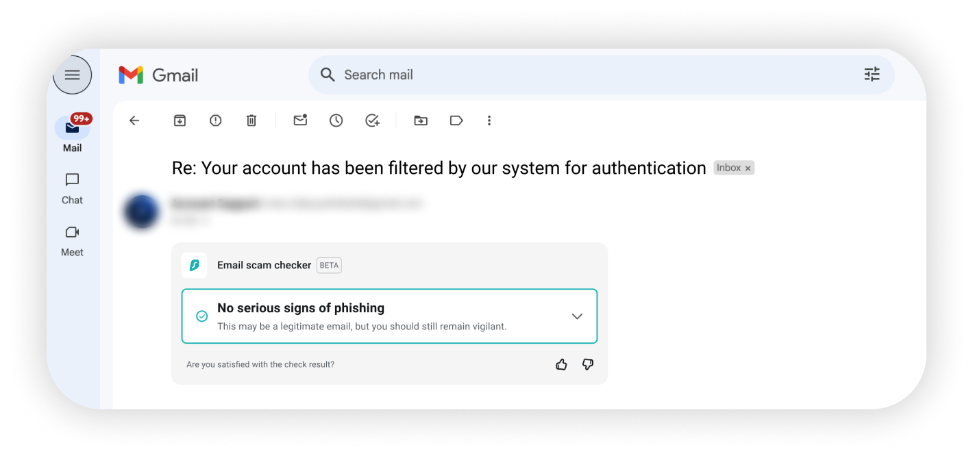After analyzing an email, the scam checker will display one of three color-coded statuses, which can be expanded to provide more detail about any detected threat.