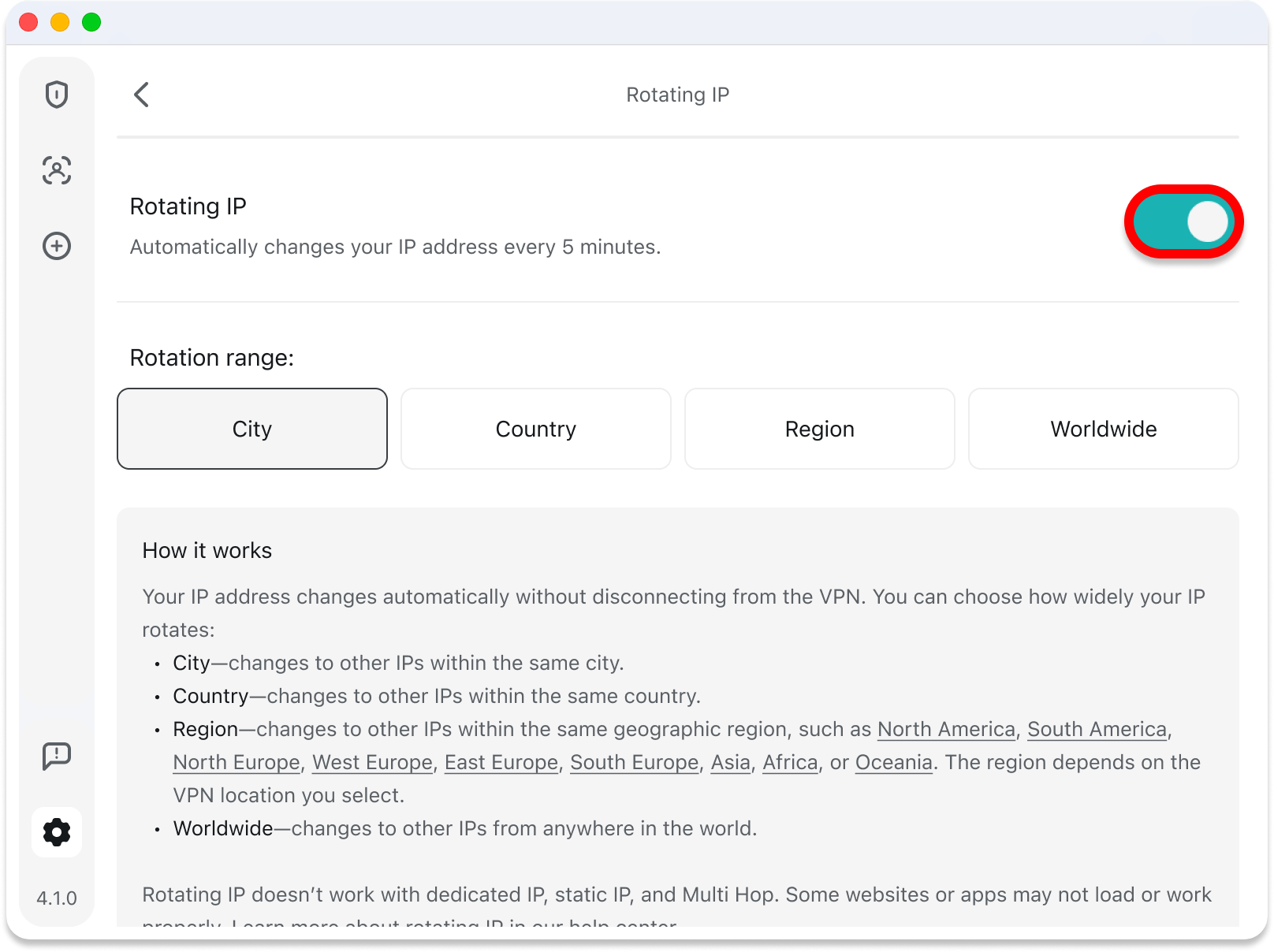 If enabled, the Rotating IP feature for macOS changes your IP address every 5 minutes within your selected city, country, region, or globally.