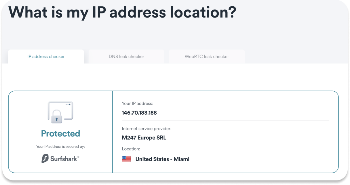 NOTE: Customers connected to Surfshark’s Dedicated IP should check their connection’s integrity on the following page while ensuring that the IP matches their Dedicated IP address.