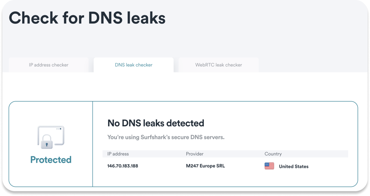 NOTE: Customers connected to Surfshark’s Dedicated IP should check their connection’s integrity on the following page while ensuring that the IP and DNS addresses match