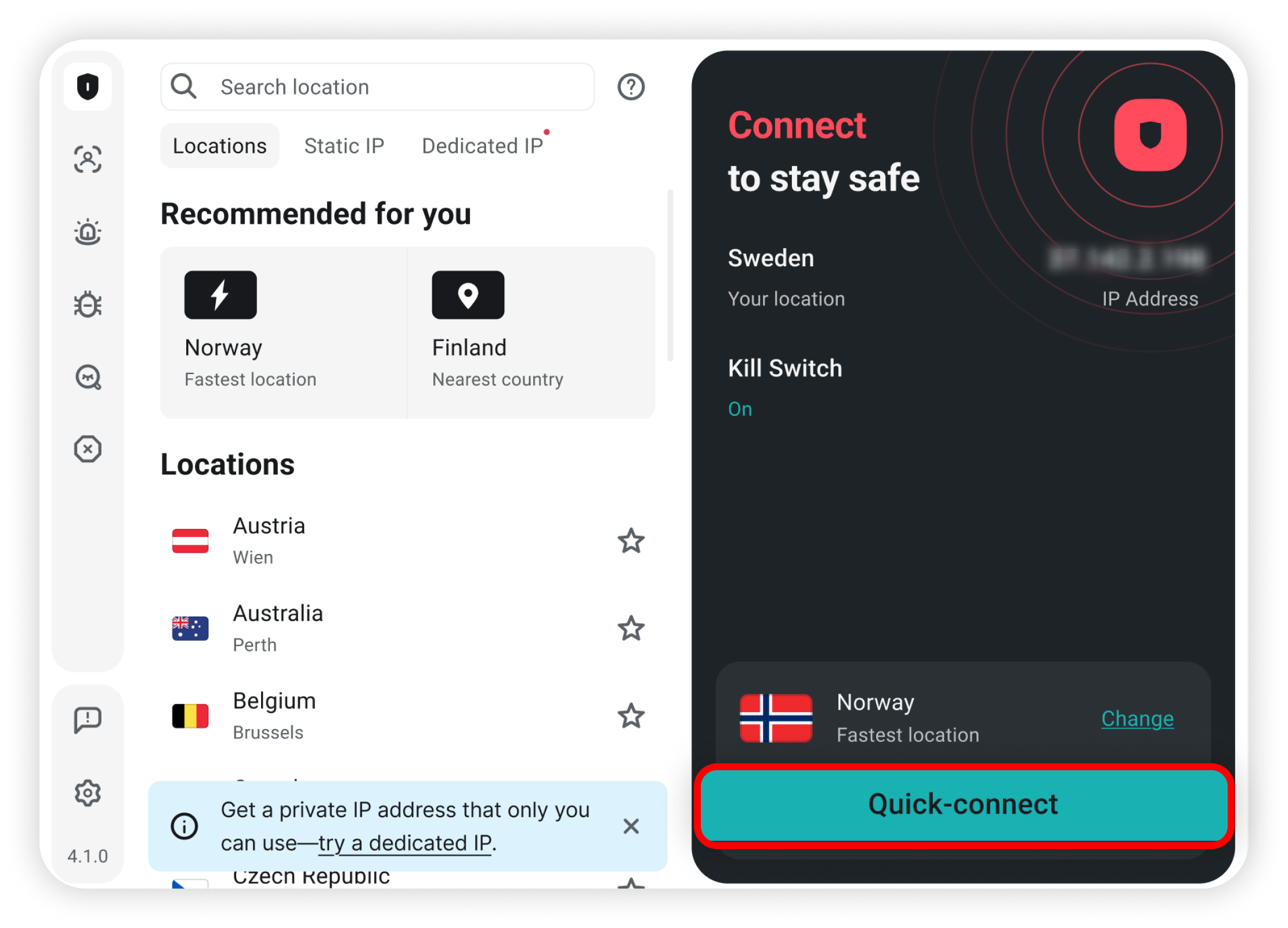 • Quick-connect. Click the Quick-connect button. This will automatically connect you to the best-performing server: