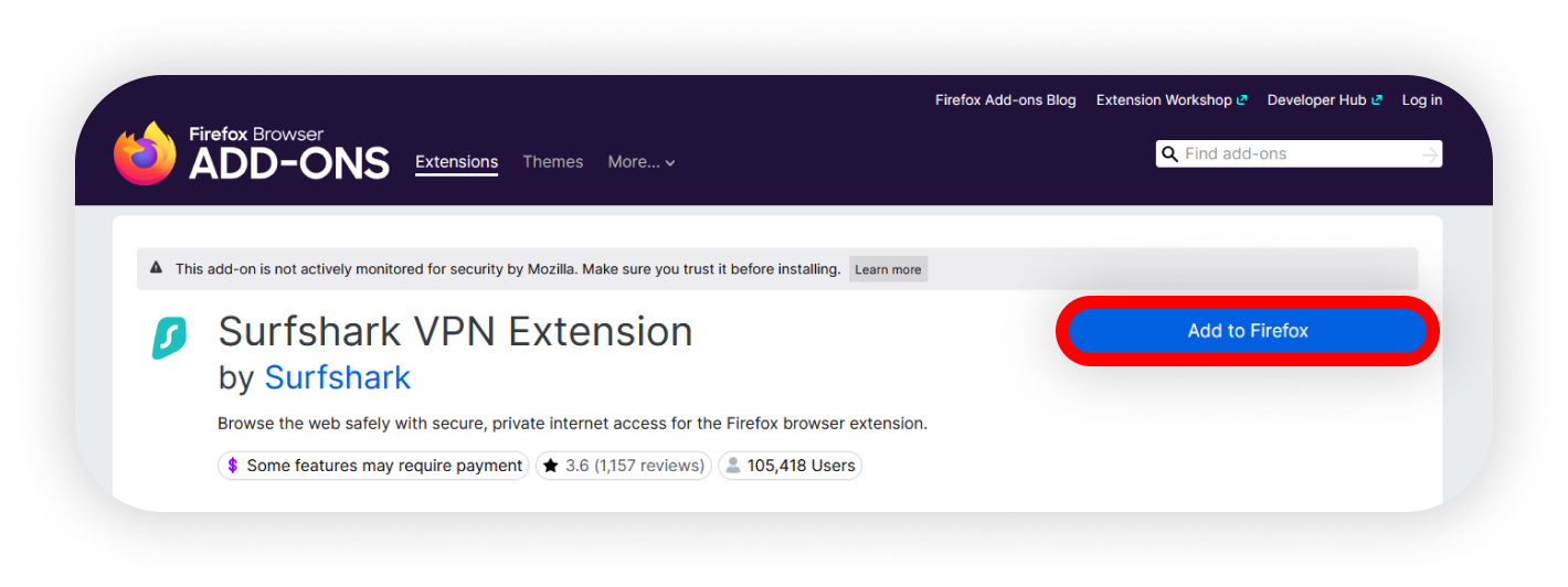 1. Add the Surfshark VPN extension to your browser. You can find it by searching on the Firefox add-on store or by clicking the download link on Surfshark's website.