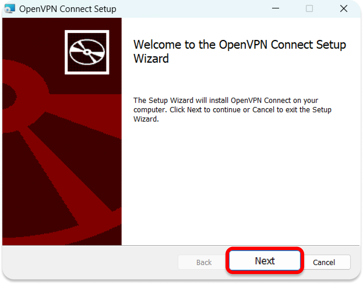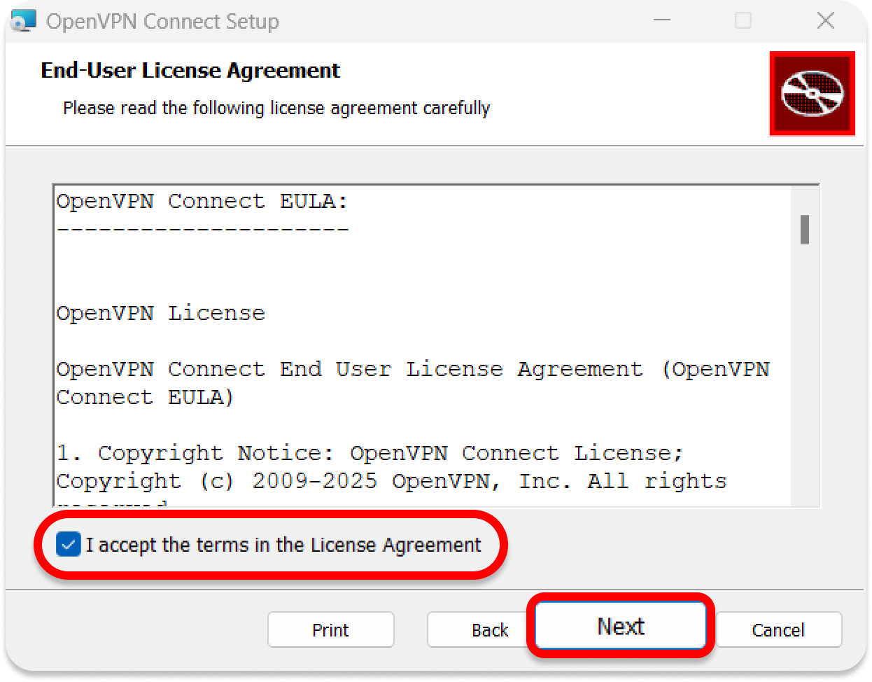 To proceed, accept the OpenVPN terms in the License Agreement, and click Next.