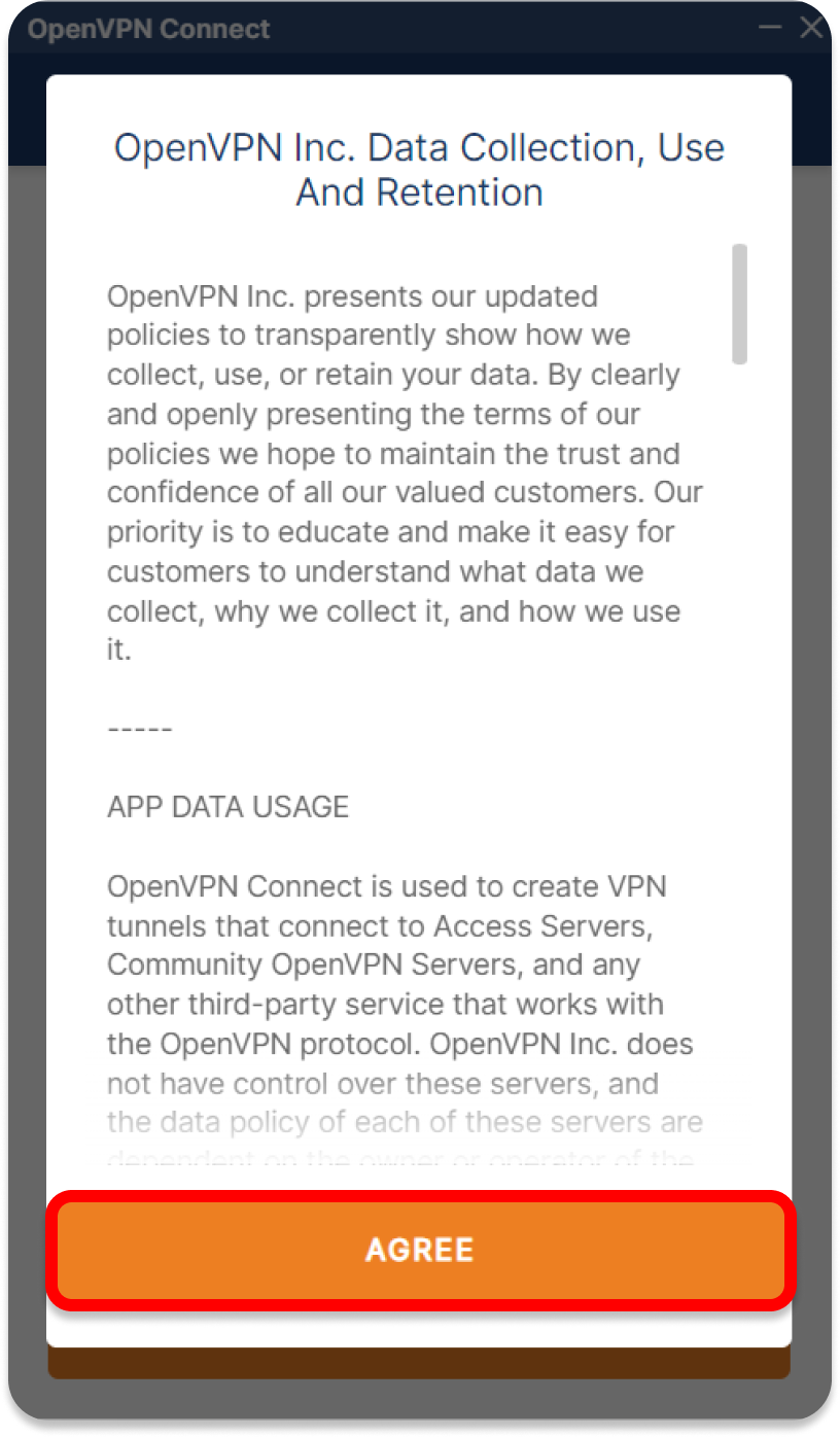 As the installation finishes, the OpenVPN Connect app will open automatically. Click agree to proceed.