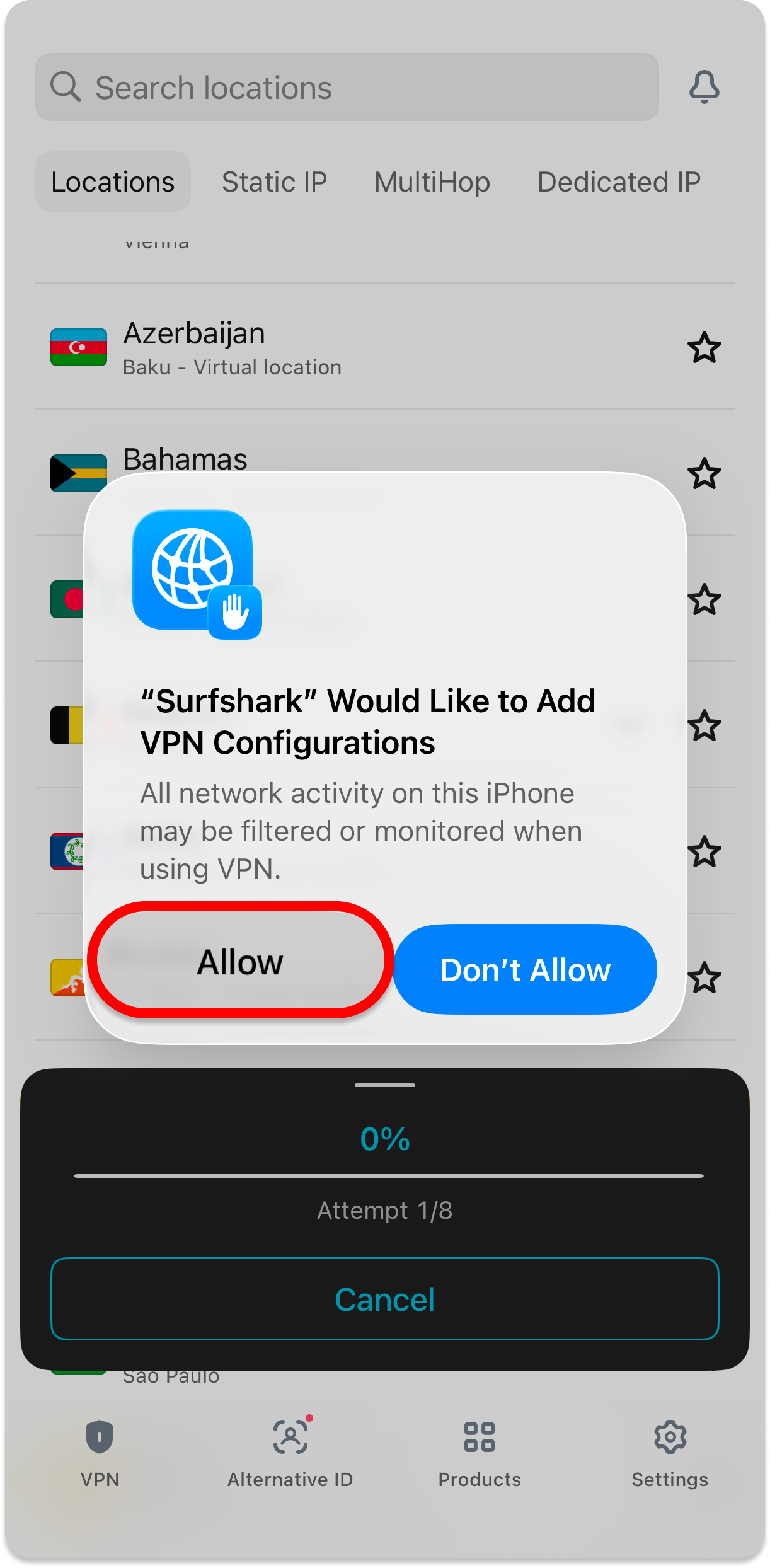 When making a VPN connection for the first time, Surfshark will need to add VPN configurations to your device. This is necessary for Surfshark to create and manage the VPN tunnel.