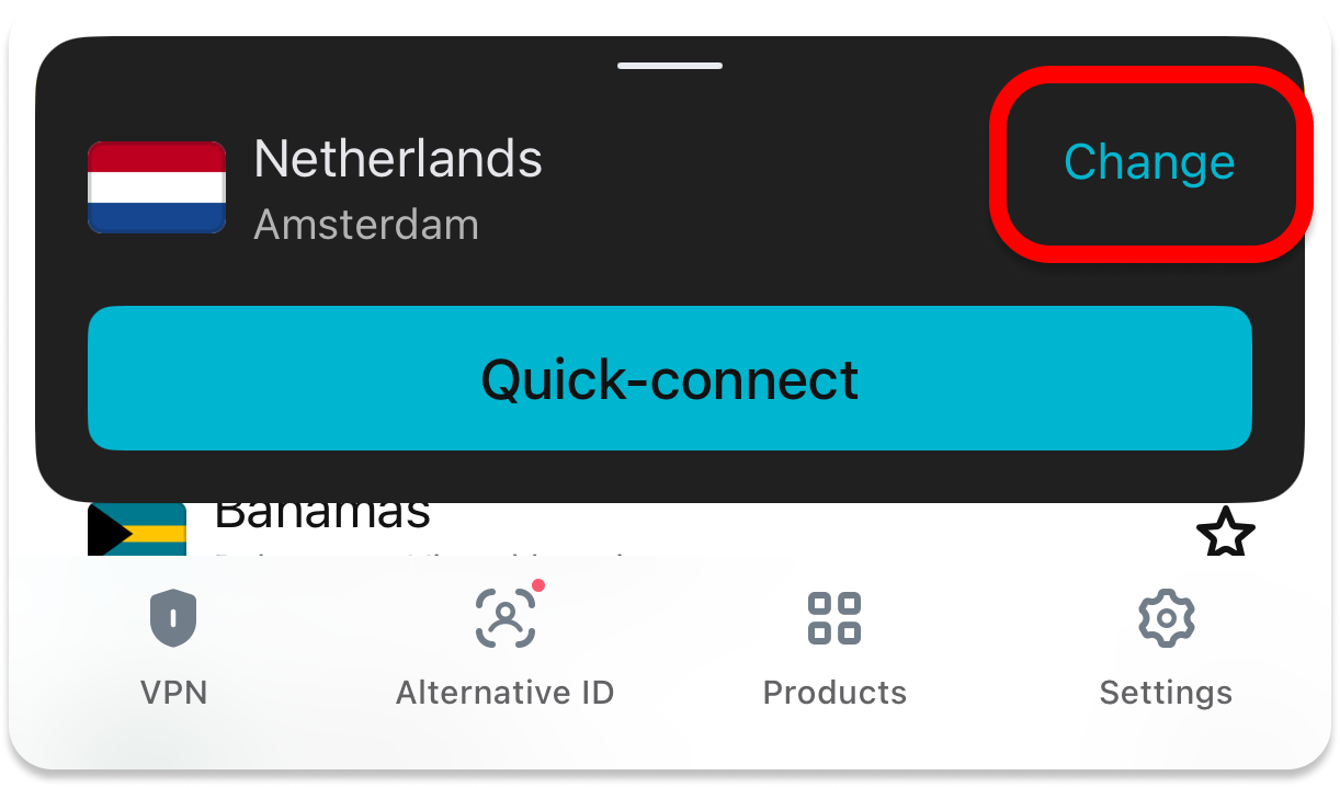 You may also choose the fastest server or the nearest country as your default location. To do that, tap the change button: