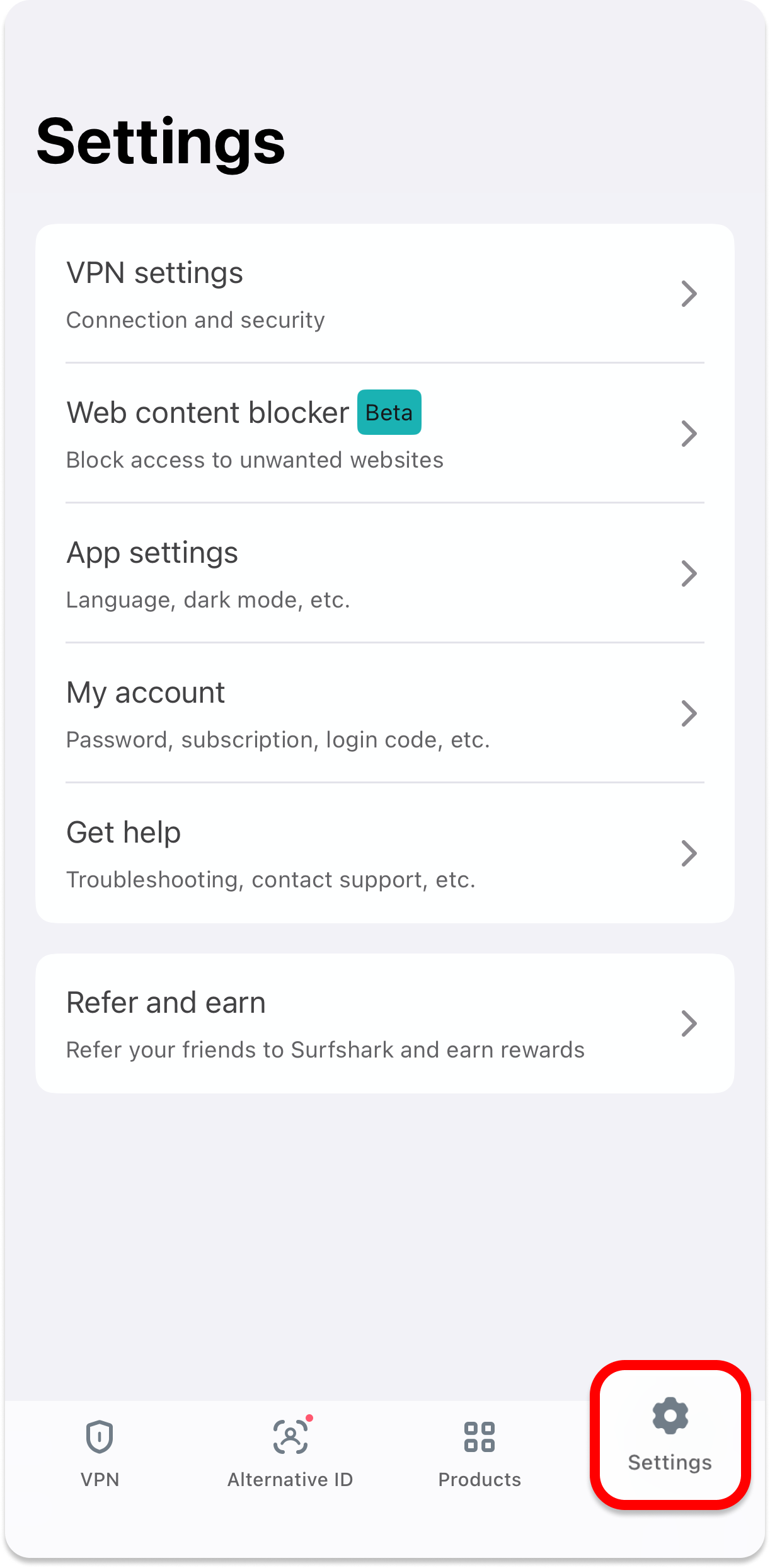 Manage the Surfshark app according to your preferences. Open the settings tab at the bottom right: