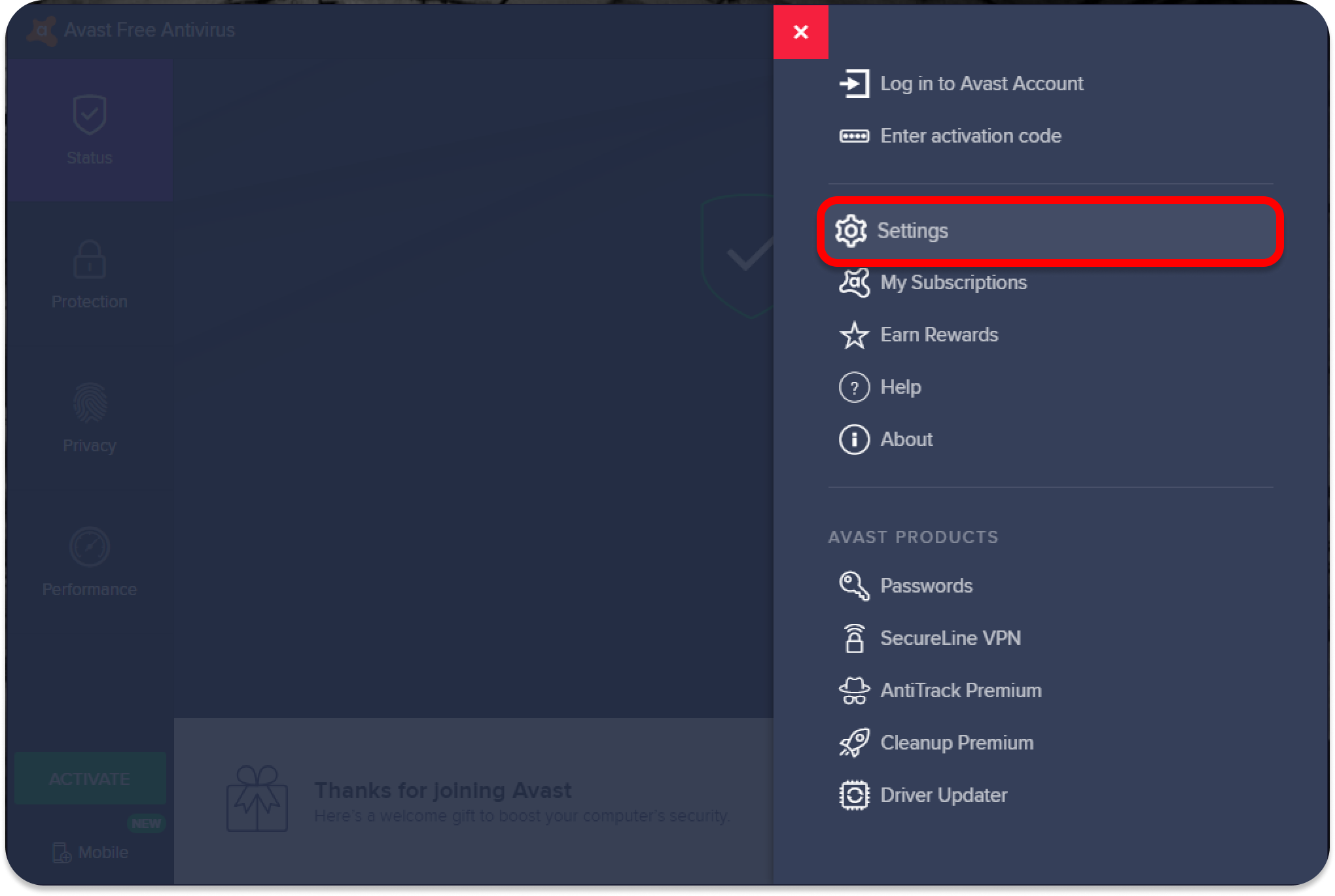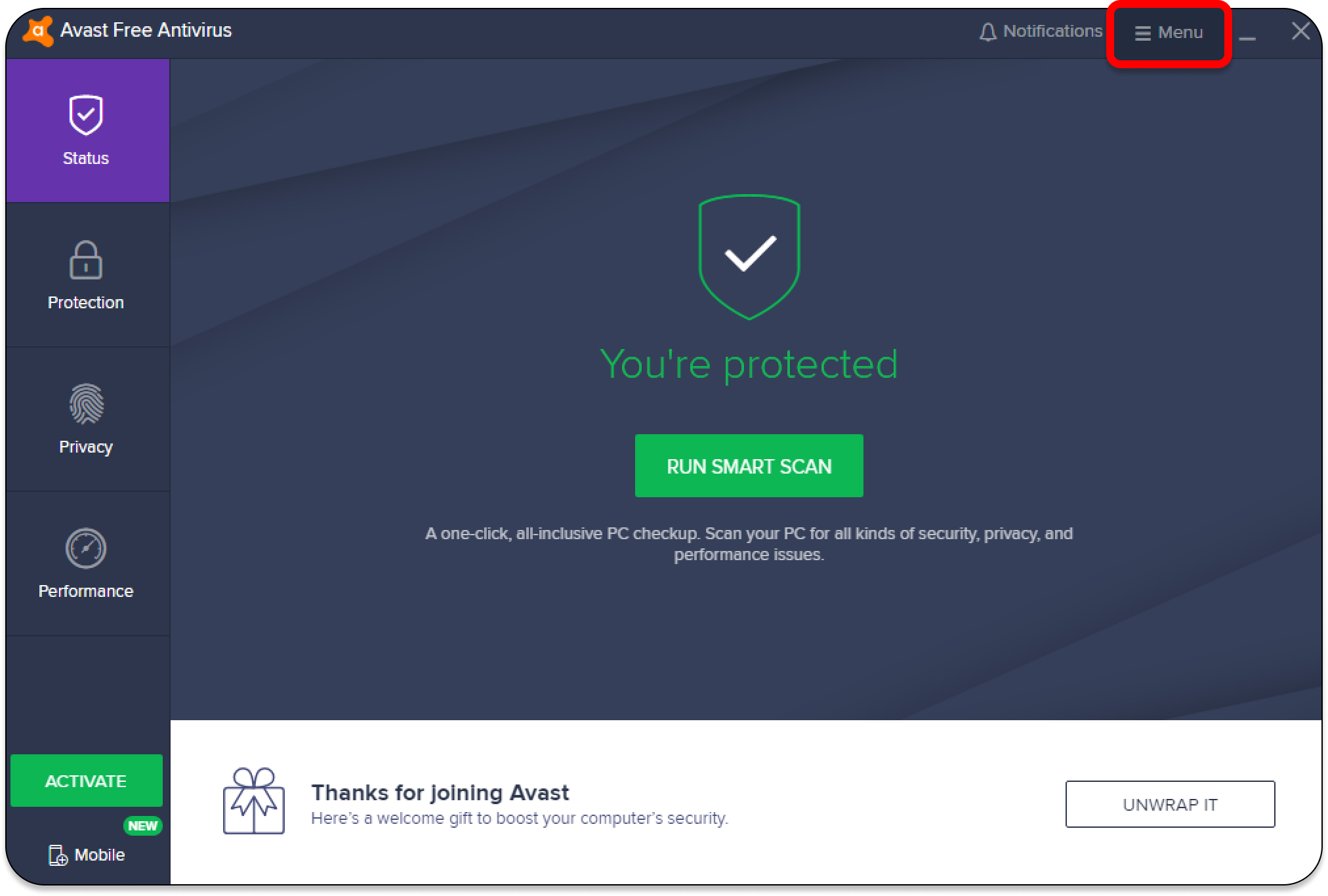 - Launch the Avast app and click the Menu button in the top-right corner.