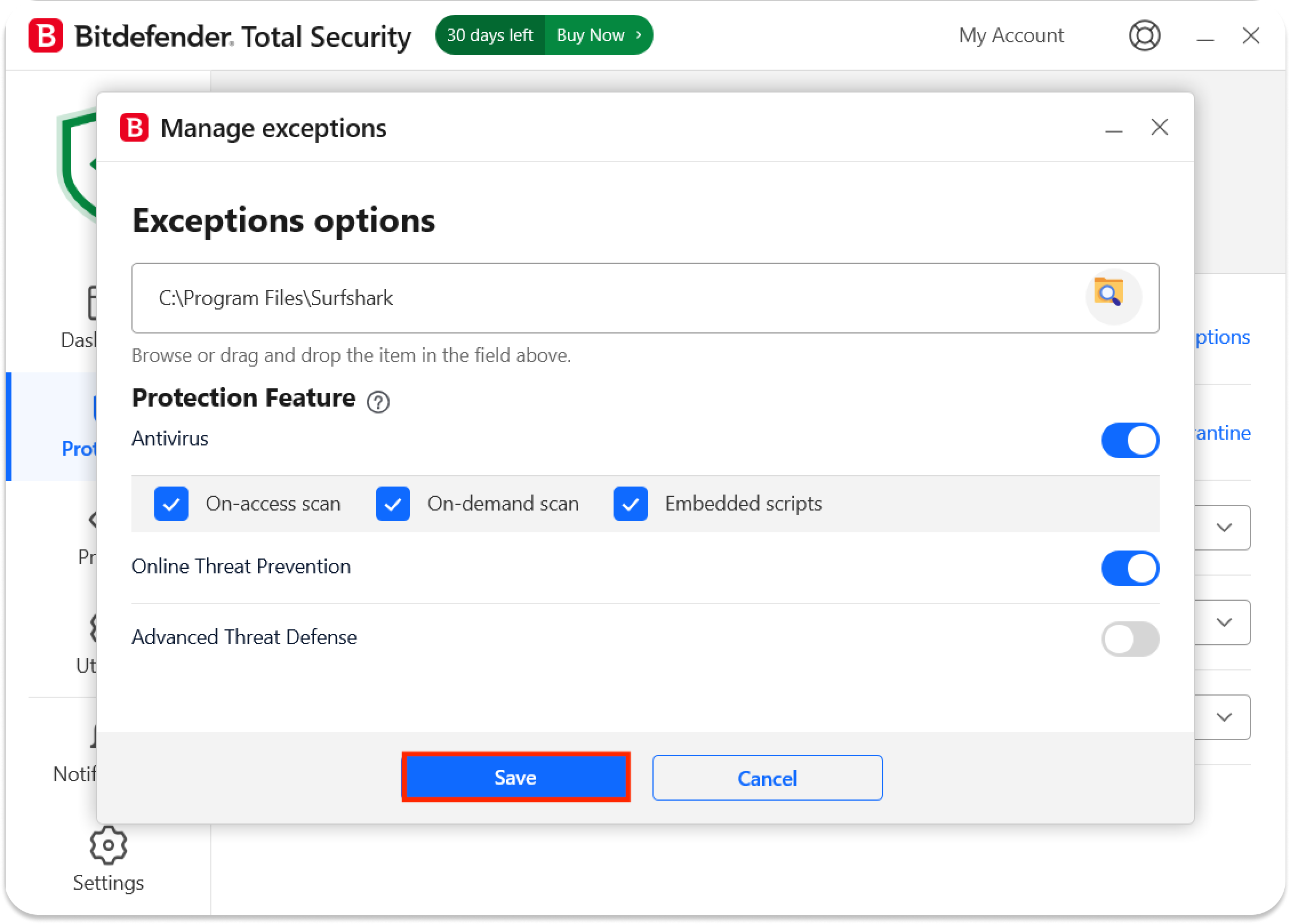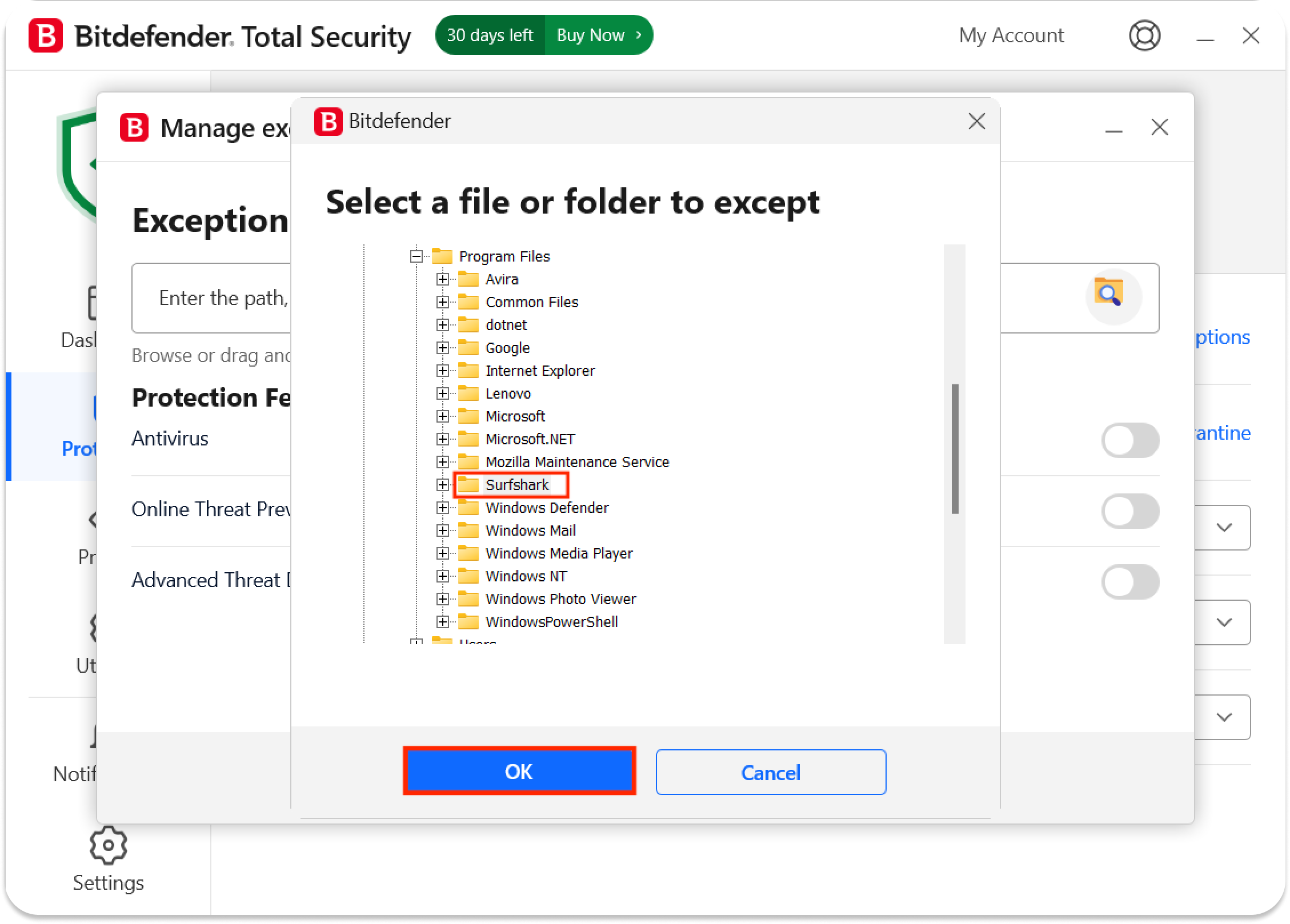 How to make an exception for Surfshark in BitDefender antivirus settings