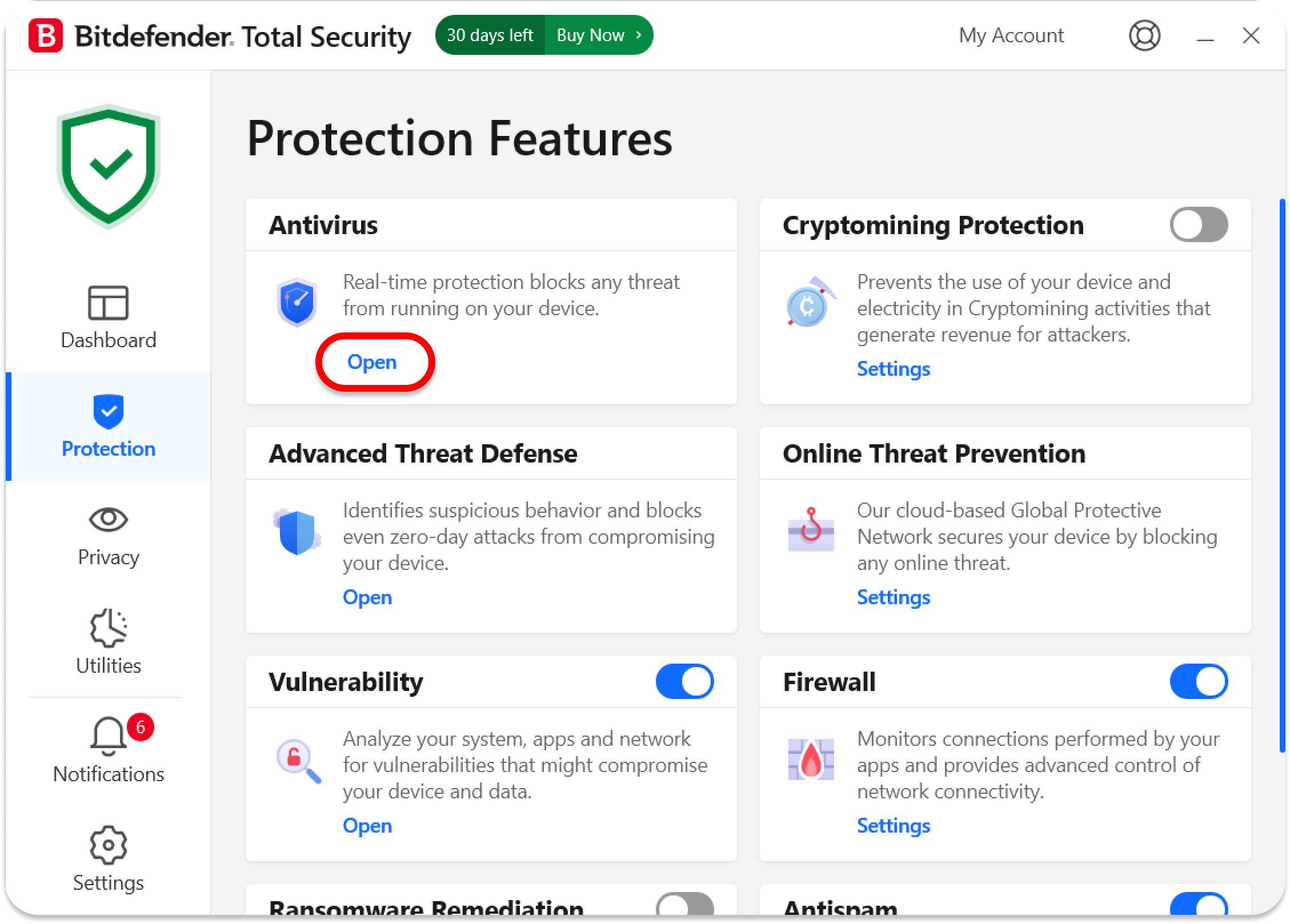 2. Under the Antivirus section, click Open.