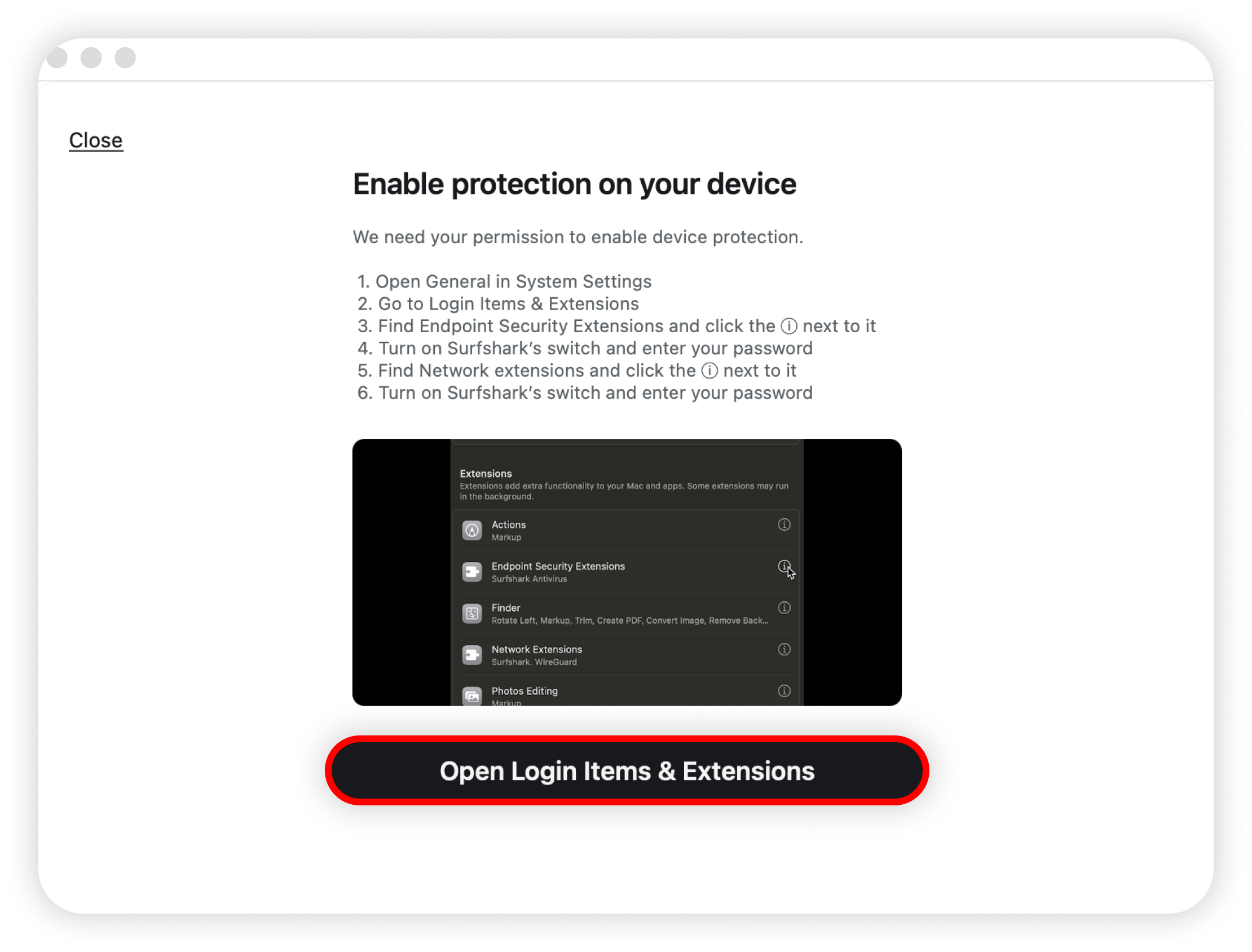 When connecting for the first time, you’ll be prompted to enable protection on your device. Click Open Login Items & Extensions and follow the on-screen instructions to continue: