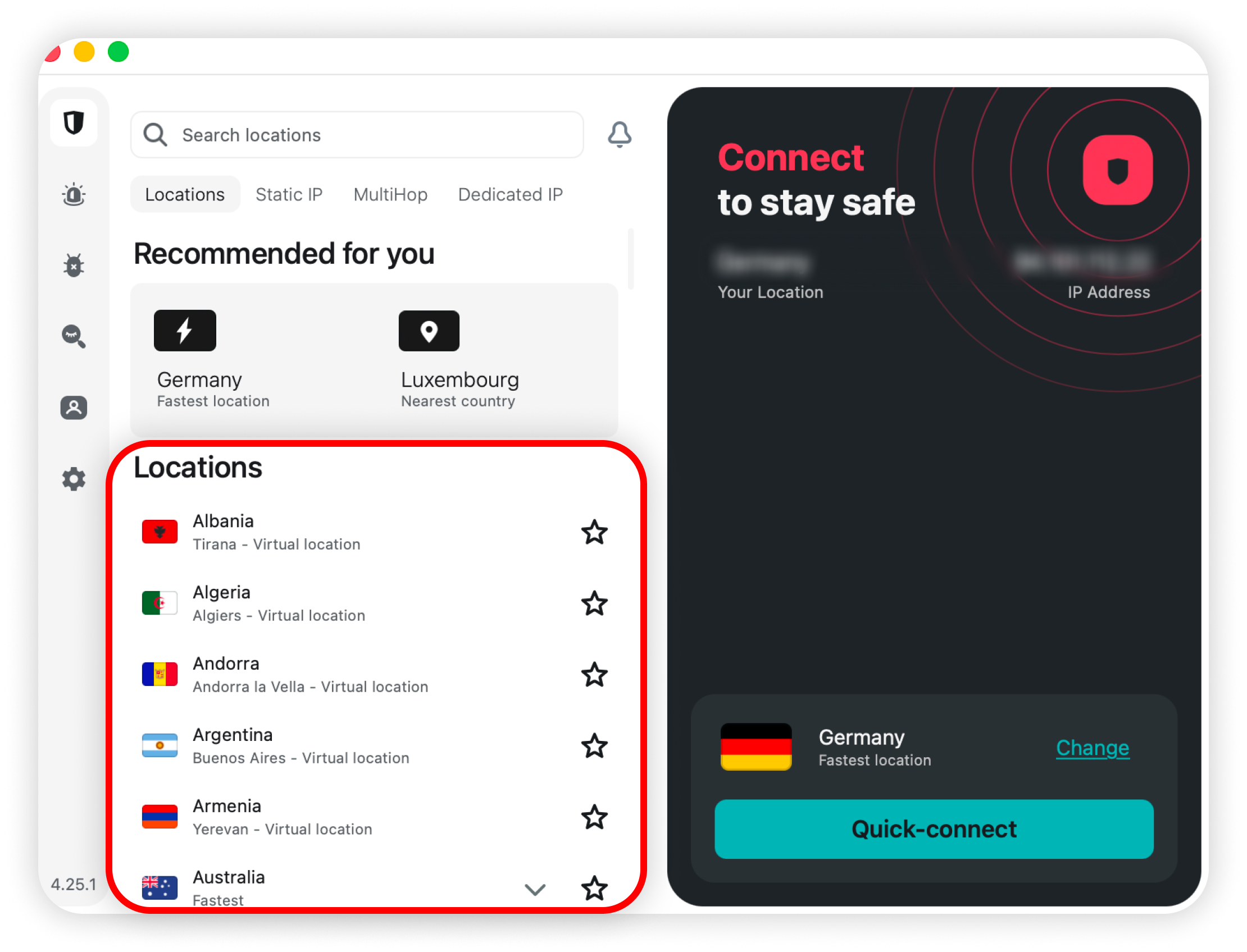 You can find the list of Surfshark locations on the left side of the app. Use the search bar or scroll through the list to find your desired location, then click the flag icon to connect instantly: