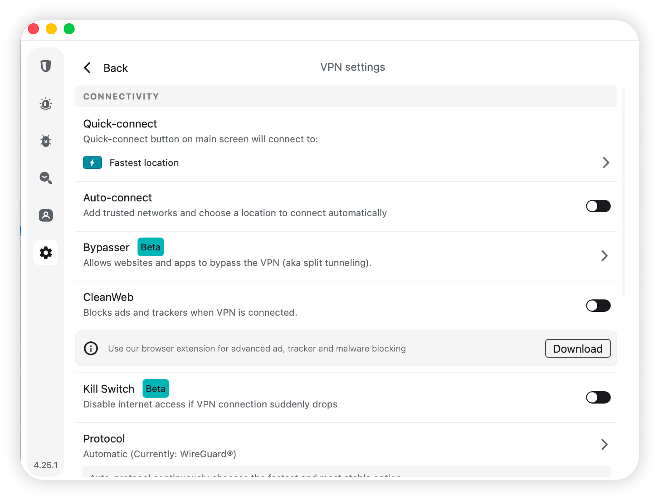 - Enable KillSwitch - a feature that protects you from unexpected VPN disconnections.