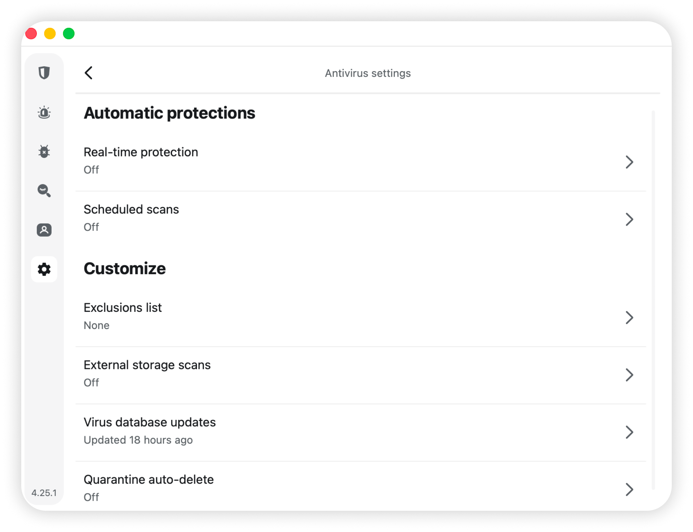 - Customize additional features such as exclusions list, external storage scans, check virus database updates and enable the quarantine auto-delete feature.
