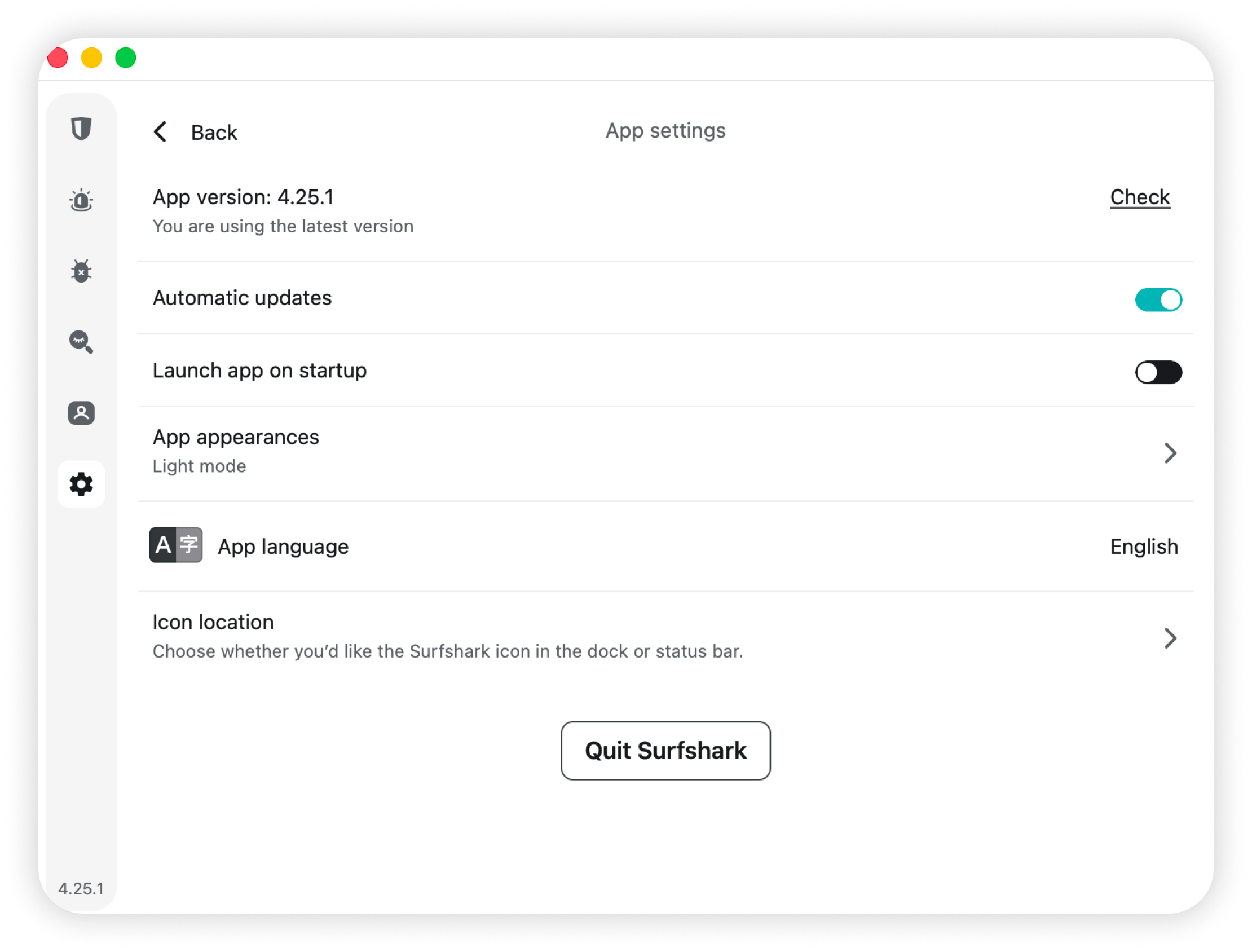 - Choose whether the Surfshark icon appears in the dock or the status bar.