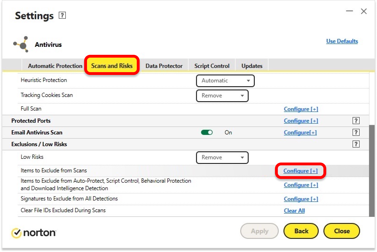 - Once you are in the Antivirus settings menu, click on the Scans and Risks tab, scroll down to the bottom, and click on Configure next to Items to Exclude from Scans.