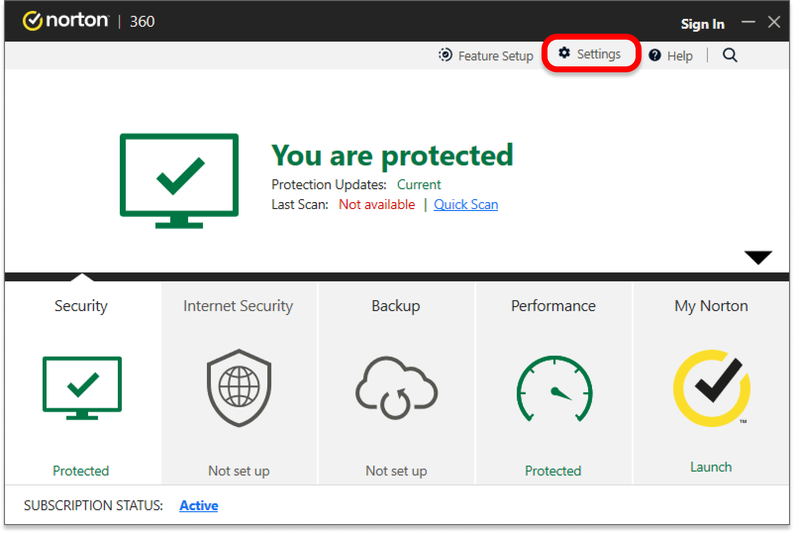 - Launch the Norton application and click on the Settings button at the top right of the window.
