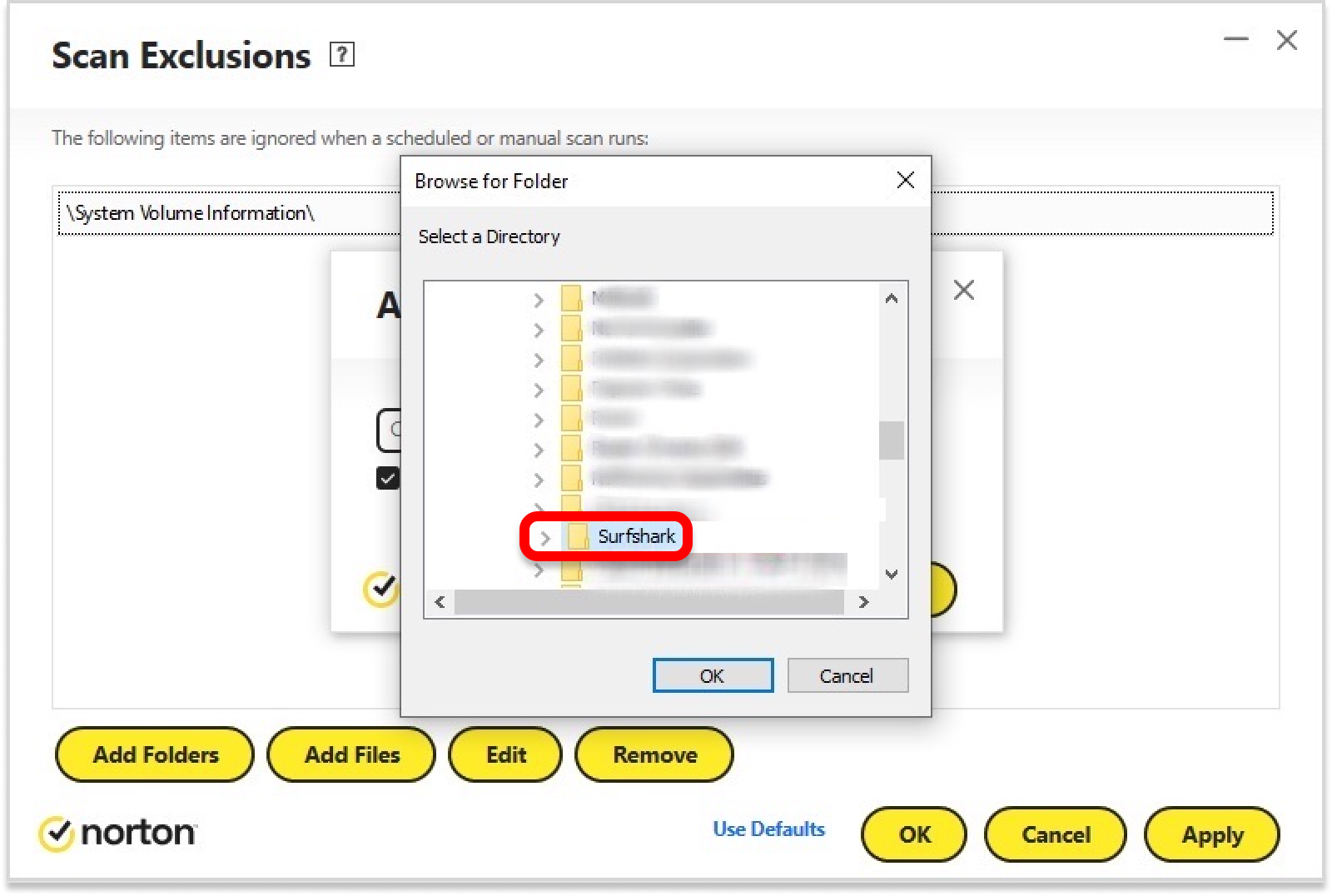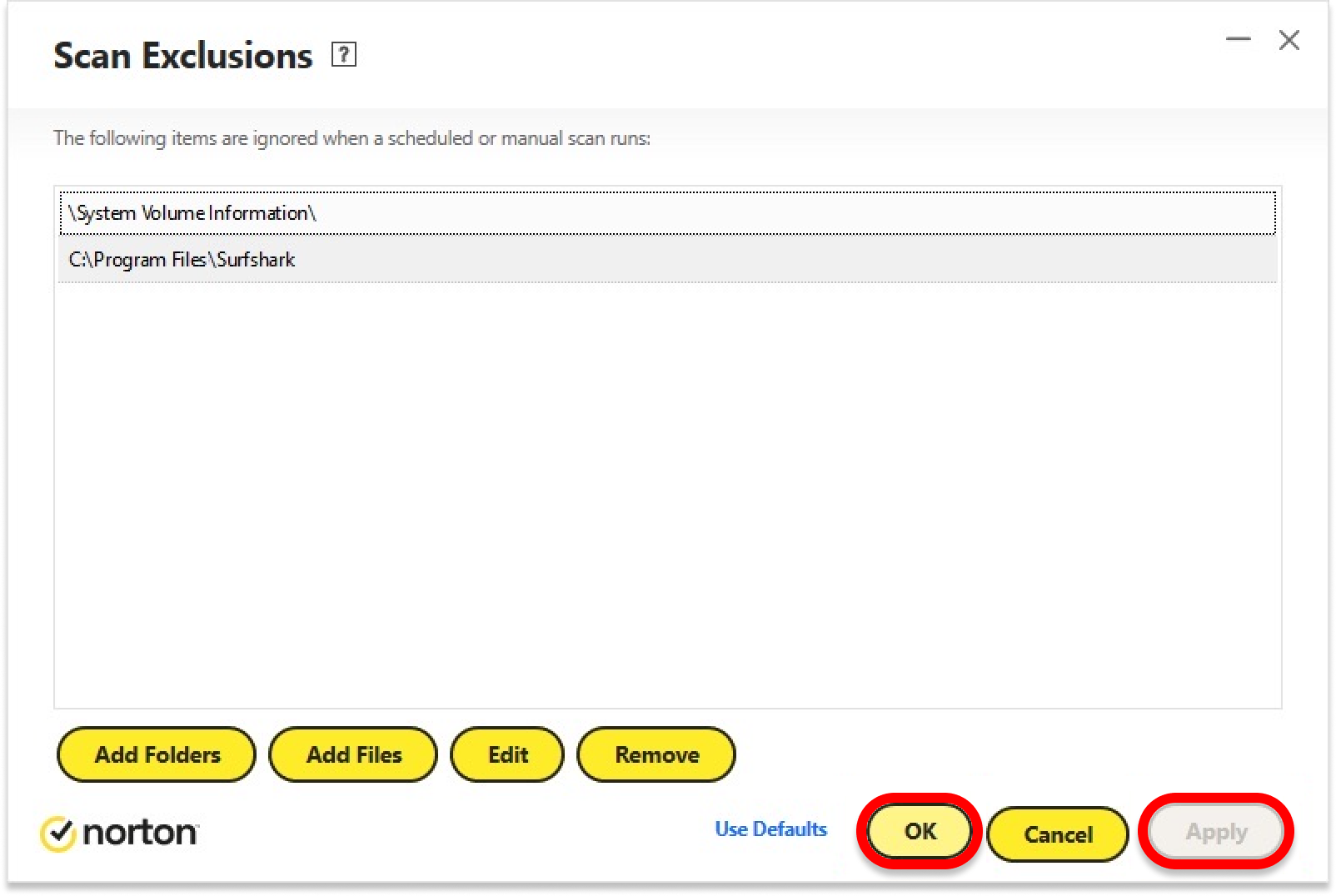 - Now, the pathway to Surfshark's folder should be visible in the Scan Exclusions window. All that is left to do is to press Apply and OK to save the exclusion you have just added.