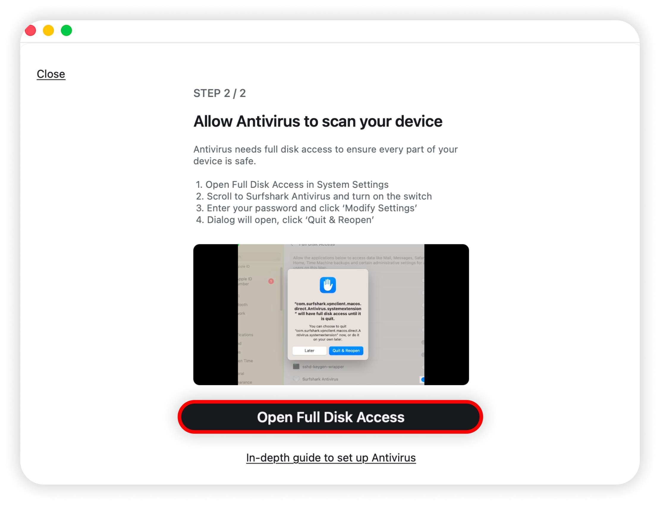 5. Return to the Surfshark app and click Open Full Disk Access: