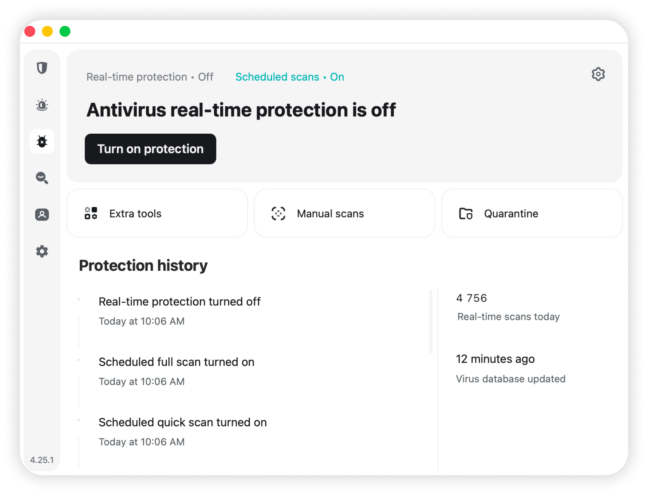8. After the scan is complete, you’ll see the main Antivirus dashboard. Click Turn on protection to enable continuous protection: